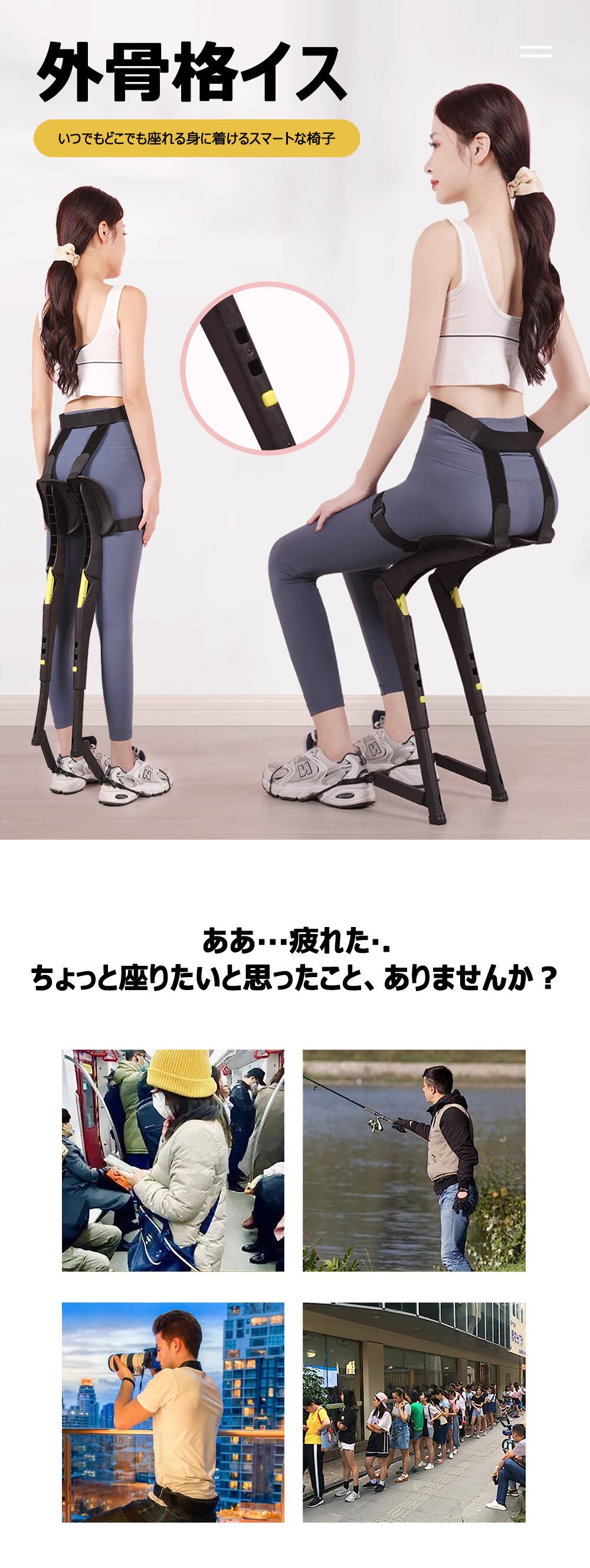 【いつでもどこでも自由に座れる】外骨格イスの最大の特徴は屋内でも屋外でも、いつでもどこでも座れる事です。工場の組立ライン作業員、美容師、釣り愛好家、観光客、足や腰が不便な高齢者など、特別な仕事にはとてもフレンドリーです。