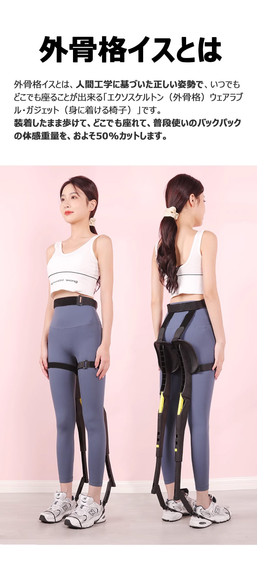 【外骨格イス】人間工学に基づいた正しい姿勢で、いつでもどこでも座ることが出来る「エクソスケルトン(外骨格)ウェアラブル?ガジェット(身に着ける椅子)」です。装着したまま歩けて、どこでも座れて、普段使いのバックパックの体感重量を、およそ50%カットします。