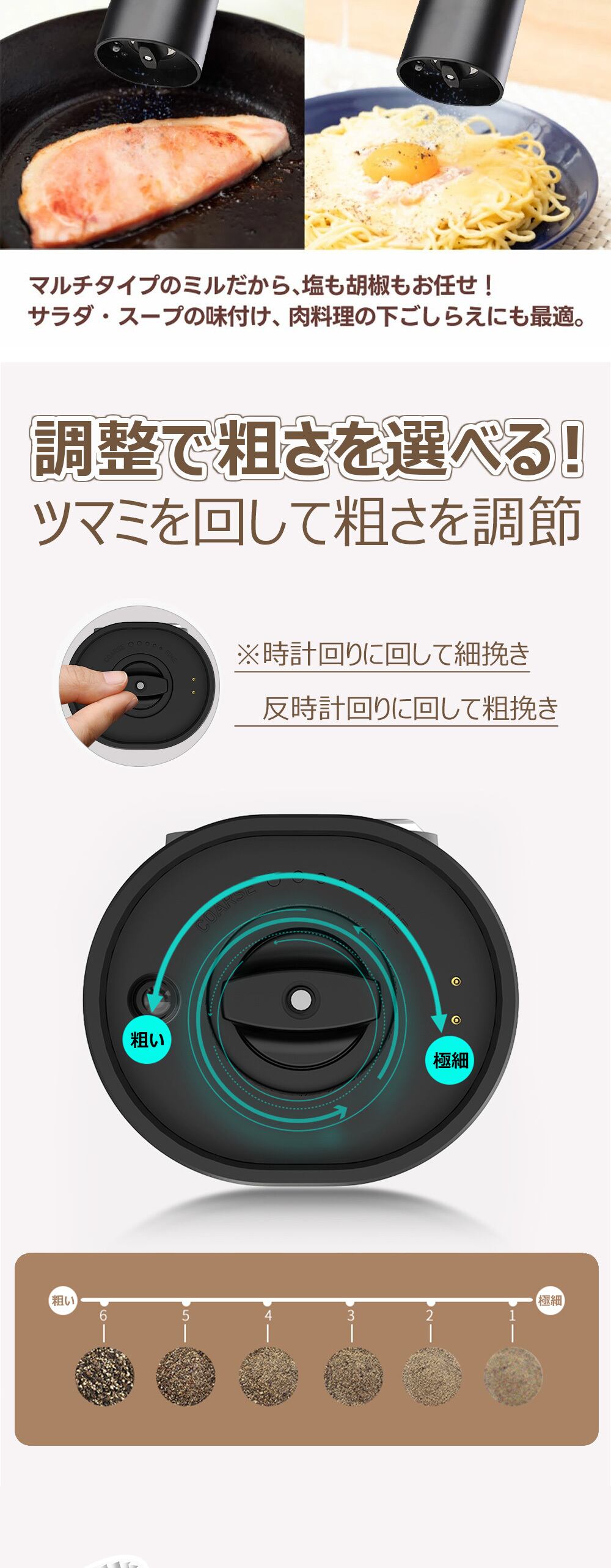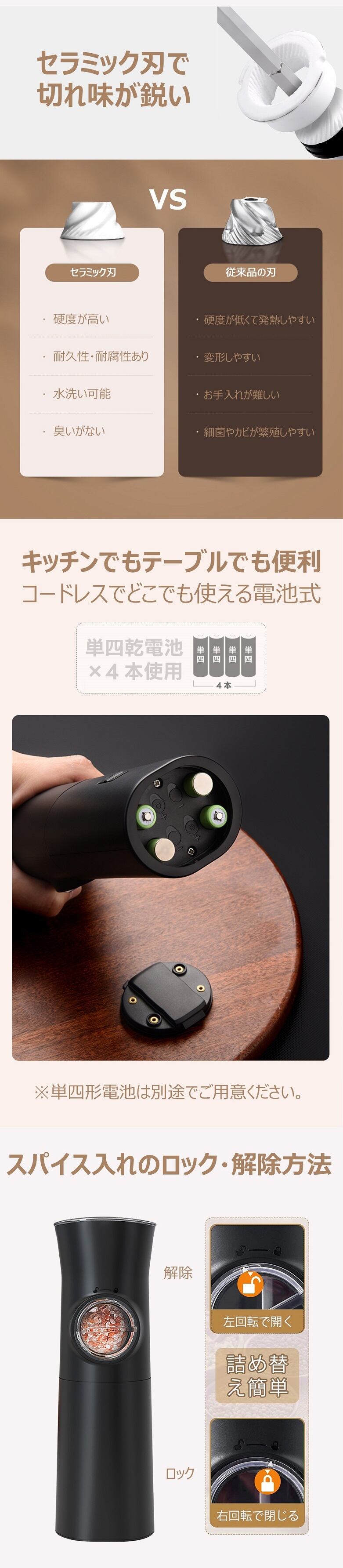 kymq-1819【片手で傾けるだけ 挽ける】電動ミル 重力センサーを搭載 スパイスミル 電動 ペッパーミル ソルトミル 電池式 セラミック 粗さ調整 片手 ミル