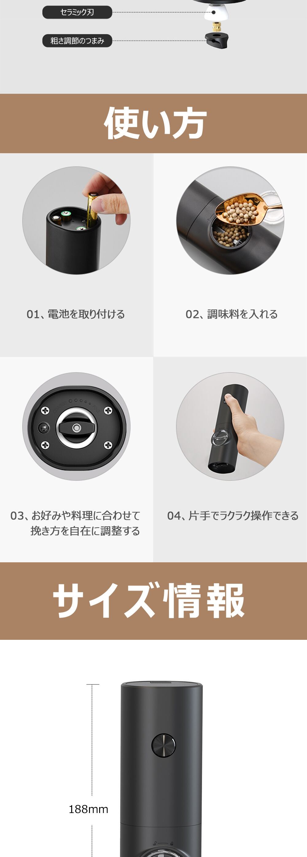 kymq-1416【片手でボタンを押すだけ 挽ける】電動ミル スパイスミル 電動 ペッパーミル ソルトミル 電池式 セラミック 粗さ調整 片手 ミル ソルト ペッパーミル