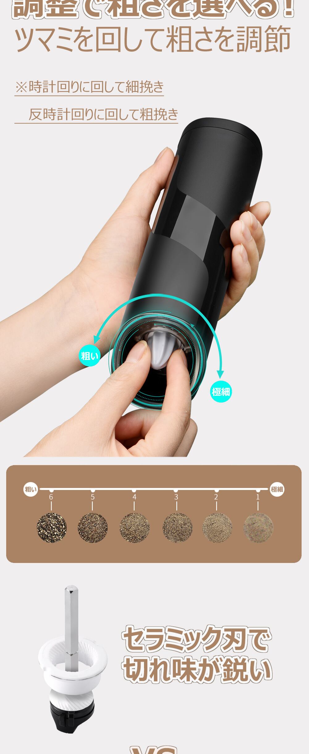 kymq-4【片手で傾けるだけ 挽ける】電動ミル 重力センサーを搭載 スパイスミル 電動 ペッパーミル ソルトミル 電池式 セラミック 粗さ調整 片手 ミル ソルト ペッパーミル