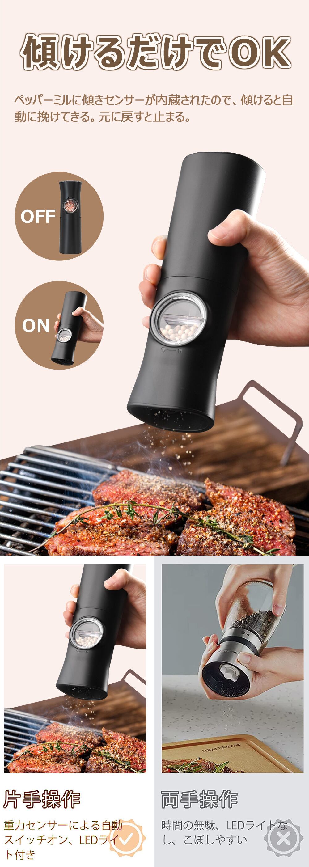 kymq-1819-d2【片手で傾けるだけ 挽ける】電動ミル セット スタンドベース付 収納 充電 重力センサーを搭載 スパイスミル 電動 ペッパーミル ソルトミル