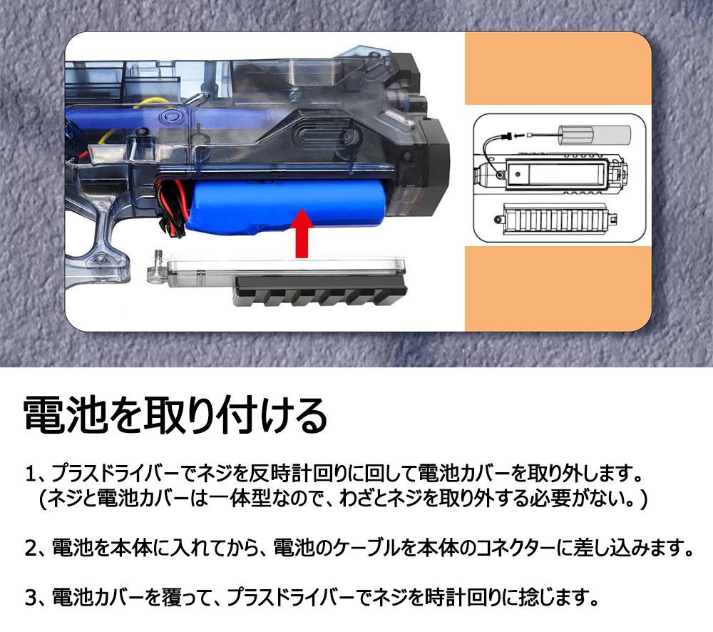 鉄砲本体*1、タンク1*1、タンク2*1、18650電池*2、USB充電ケーブル*1、プラスドライバー*1、取扱説明書*1